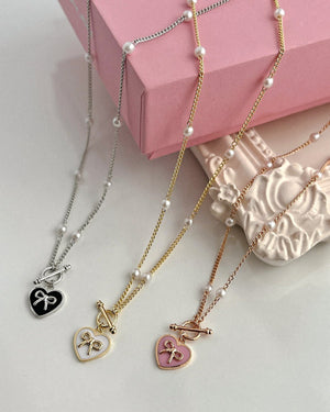 KOKOA Heart-Shaped Charm Necklace with Ribbon Decor and Pearl Beads – Elegant, Stylish, and Timeless