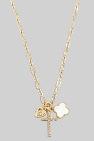 Keywords: Pave heart cross necklace, shell clover charm necklace, chain necklace with charms, elegant charm necklace, stylish necklace for women, versatile jewelry piece, modern and refined necklace, fashionable chain necklace