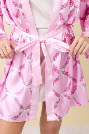 Introducing our Pink Satin Robe, perfect for adding a touch of playfulness to your wardrobe! Made from luxurious satin material, this robe features a stunning flower print. Lounge in style and comfort, or wear it as a statement piece. You'll bloom in beauty with every wear!