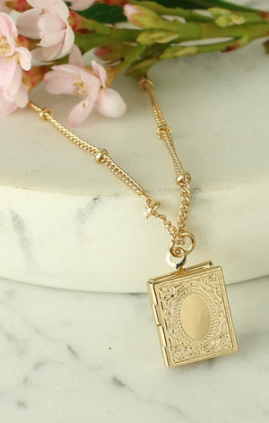 Keep your secrets close with our Secret Diary Gold Book Locket Necklace. Featuring a vintage-inspired book locket design, this bright gold necklace adds a touch of literary elegance to any outfit. With an adjustable length and secure lobster clasp, it's the perfect gift for book lovers.
